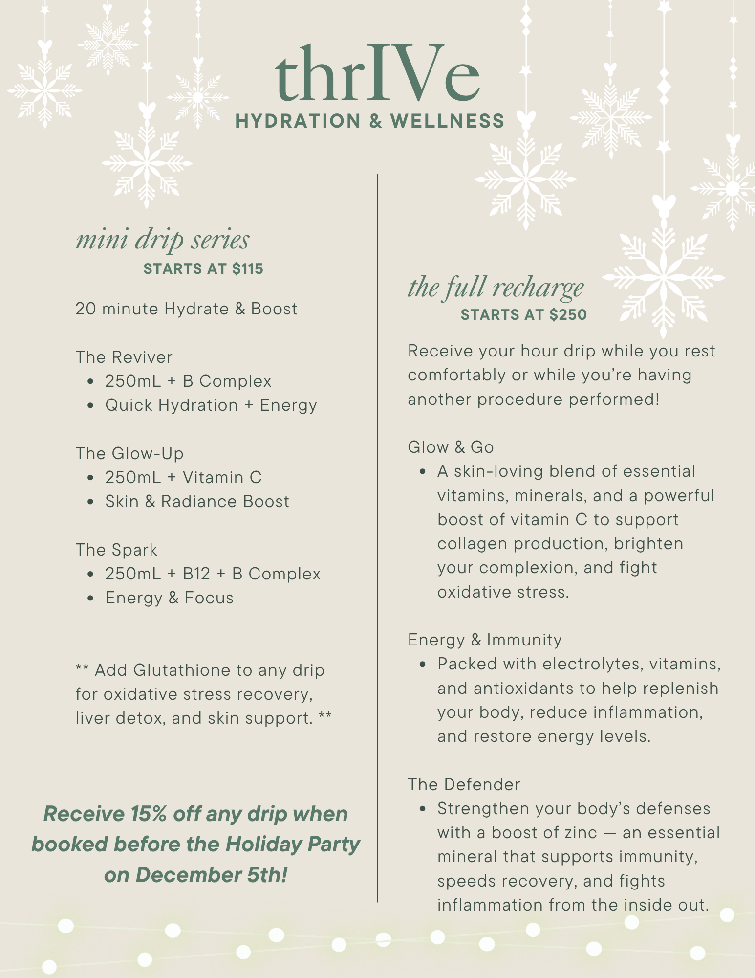ThrIVe will be on-site offering mini-drip sessions as well as our full infusion menu (see menu below)! 15% Discount applied to those who book ahead of December 5th!